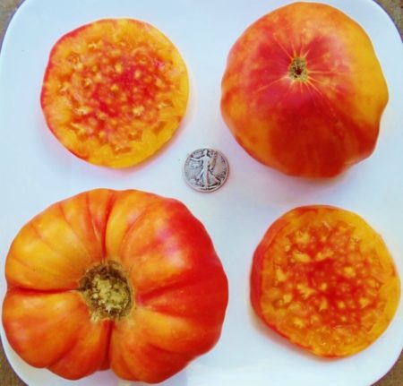Indeterminate. 85 days from transplant. This gorgeous bi-colored beefsteak originated in West Virginia. Fruits average about 1 pound and are yellow in color, streaked with red on the blossom end. Flavor is outstanding. Sweet and juicy. Heavy producer. Absolutely beautiful when sliced. Great on sandwiches. Grow something different.